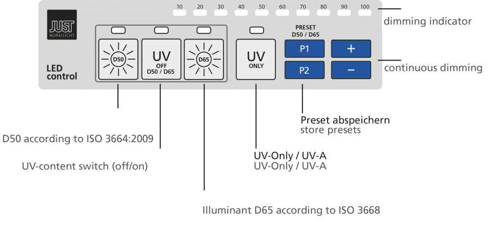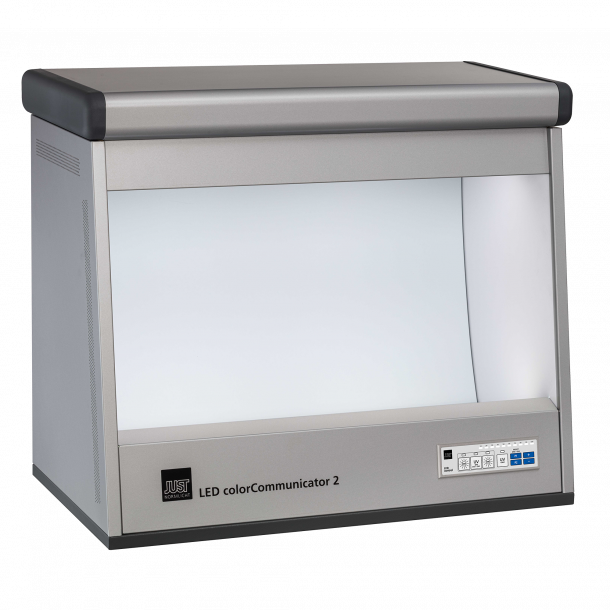 The size of a desktop viewing device united with the innovative JUST LED technology. The illuminant types D50 and D65 can be dimmed continuously and the UV-content can be switched on and off.